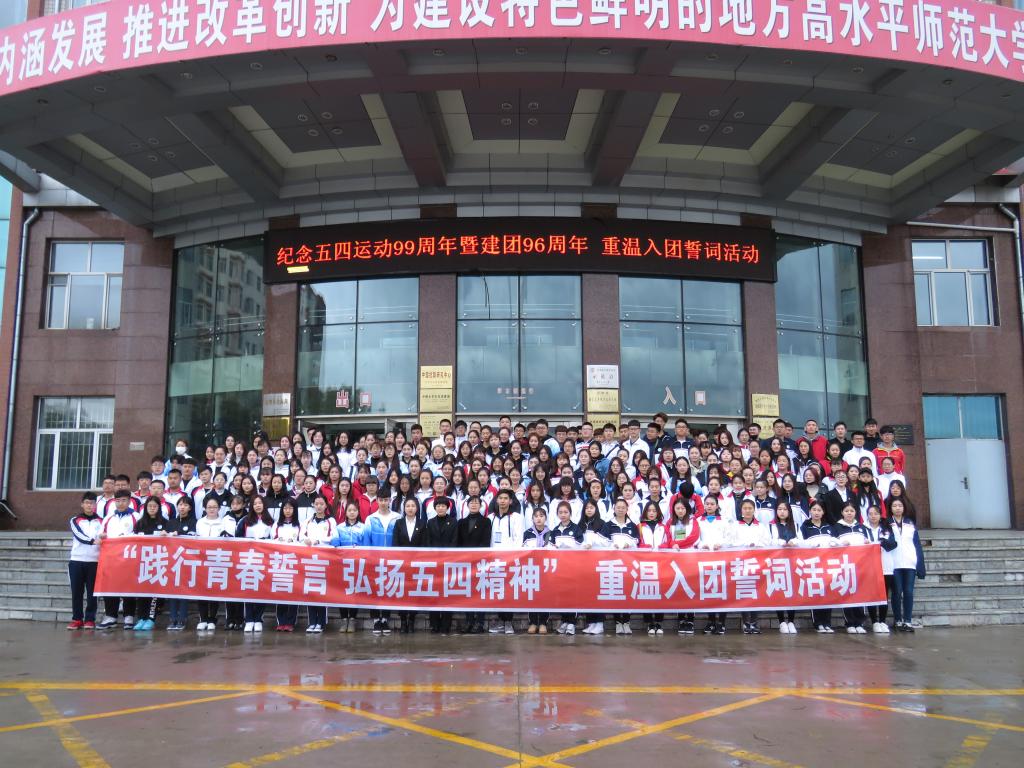 为纪念“五·四”运动99周年,中国共产主义青年团建团96周年,校团委于5月4日早7点在综合楼前举行“践行青春誓言 弘扬五四精神”重温入团誓词活动。校团委书记郑维东、宣传部部长赵薇、第六期青马工程培训班学员、校学生会及二级学院主要学生干部代表300余人参加了活动,活动由第五十三届校学生会主席赵心玉主持。